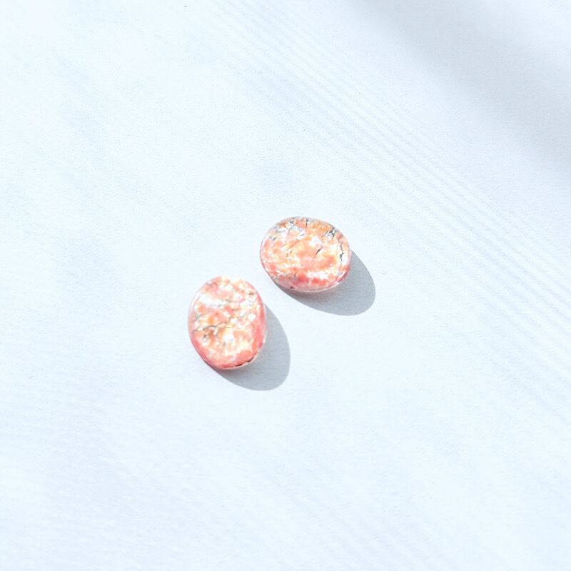 花畑を思わせるようなピンクやオレンジのマーブルに、ガラス内部にはシルバーの箔が入っています。